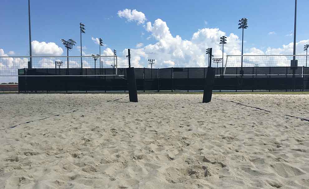 The suggested playing area consists of the court and a safety space around it measuring 10 feet in each direction. (50′ x 80′) If you don’t have this space, smaller courts can be built. (Professional organizations suggest a 70′ x 100′ space with a 20′ buffer around the court but we feel this is excessive due to the increased cost of sand around the court) The space above the playing area should be free of obstructions. Master Systems ensures the playing area is level and consists of good quality sand to a thickness which prevents players from contacting the underlying surface.